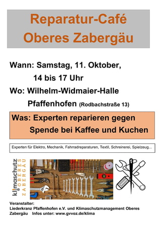 Am 11. Oktober besteht daher die Möglichkeit, zu reparierenden Gegenstände zu bringen. In gemütlicher Atmosphäre bei Kaffee und Kuchen kann man die Wartezeit zum Gespräch mit Bekannten, Freunden, Mitbürgerinnen und Gästen aus der nahen Umgebung nutzen.