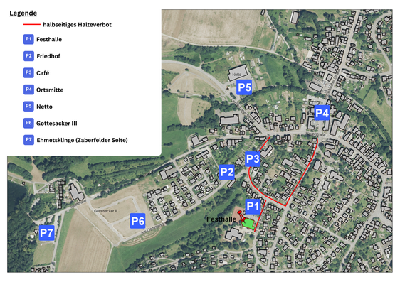 In erster Linie sollten die Parkplätze am Café Leinberger, beim Friedhof, am Netto, in der Ortsmitte, beim Neubaugebiet Gottesacker 3 sowie an der Ehmetsklinge (Festplatz-Zaberfelder Seite) angefahren werden. Sofern Sie entlang einer Straße parken, weisen wir darauf hin, dass die Restfahrbahnbreite von drei Metern eingehalten und der Kurvenbereich freigehalten werden muss. Verstöße werden geahndet und falls notwendig, werden auch Fahrzeuge abgeschleppt damit im Ernstfall die Rettungswege frei sind.
