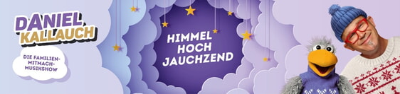Mit seiner neuen Adventsshow „Himmelhochjauchzend“ sorgt Daniel Kallauch für Spaß und Unterhaltung für die ganze Familie. Der Musiker, Komiker und Puppenspieler bringt Kinder und Erwachsene zum Lachen, in Bewegung – und zum Nachdenken. Auf kreative Weise vermittelt er, was Weihnachten heute bedeutet – ganz ohne erhobenen Zeigefinger.