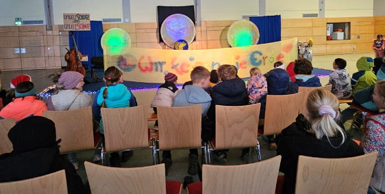 Am 03.12.2025 war das Radelrutsch-Theater zu Gast an der Grundschule Zaberfeld. Die Schule hatte sich erfolgreich über die Kreissparkasse Heilbronn für das Projekt der Klimastiftung beworben. Mit dem Titel „Happy Earthday! / Wir feiern die Erde“ präsentierte das Ensemble in der Mehrzweckhalle sein Stück mit Augenmerk auf Themen wie Müll, Wasser, Energie, Luftverschmutzung und Umweltschutz. Die Zuschauer wurden dadurch zu eigenem Engagement für eine nachhaltige Zukunft motiviert – danke an das Mut-Mach-Musical!