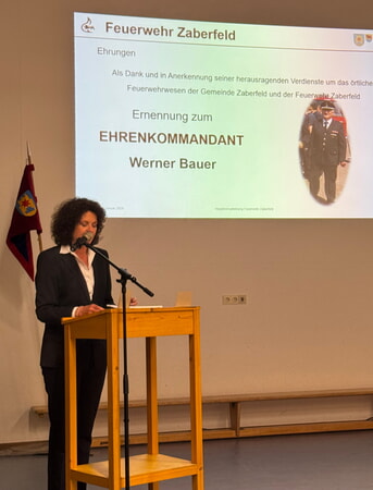 Eine besondere Ehrung wurde Werner Bauer zuteil. An diesem Abend ernannte Ihn Bürgermeisterin Diana Danner zum Ehrenkommandanten der Feuerwehr Zaberfeld. In seiner aktiven Laufbahn die 1978 begann, übernahm er lange Jahre Führungsverantwortung. Im Jahr 1992 wurde er zum Abteilungskommandanten in Ochsenburg gewählt. Dieses Amt führte er auch nach der Zusammenlegung mit Leonbronn bis 2006 weiter. Zudem hatte er das Amt des stellv. Gesamtkommandanten von 1994 bis 2007 inne. Von 2007 bis 2012 stand Werner Bauer als Gesamtkommandant an der Spitze der Feuerwehr Zaberfeld. In ihrer Ansprache würdigte Bürgermeisterin Danner sein Wirken und betonte, dass seine Arbeit beispielhaft für Verantwortungsbewusstsein und Zusammenhalt in der Feuerwehr stehe.