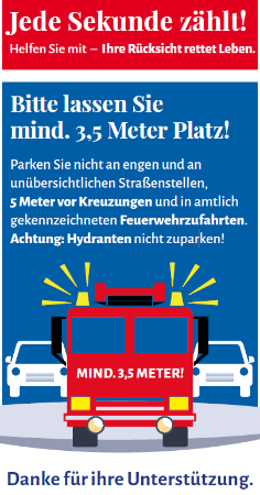 Eine Restfahrbahnbreite von 3,10 Metern muss immer gewährleistet sein, damit die Einsatzkräfte ungehindert zu der Einsatzstelle gelangen können. Wenn Kreuzungen zugeparkt werden, ist für Rettungsfahrzeuge auch kein Durchkommen mehr möglich. Halten Sie daher bitte den gesetzlich geforderten 5 Meter Abstand in den Kreuzungsbereichen ein! Auch bitten wir alle Fahrzeugführer nicht auf Gehwegen zu parken. Ältere Menschen mit Rollatoren oder Eltern mit Kinderwägen müssen dann auf die Straße ausweichen, was wiederrum sehr gefährlich sein kann.