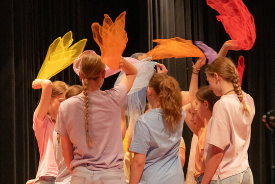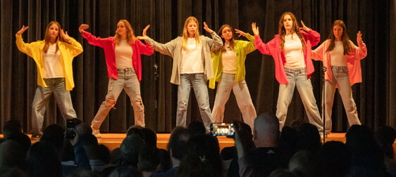 Im ersten Teil des Abends zeigten die farbenfrohen Teams der beiden Tanz-AGs ihr Können: Zunächst startete die Showtanzgruppe der Klassenstufe 5-7 in den Abend, die mit bunten Tüchern ein Flammenmeer auf die Bühne zauberten – und später folgten die jungen Damen der Klassenstufe 8-10, die in bunten Jacken und mit hellen Jeans gekleidet waren und mit ihrer ansprechenden Tanzpräsentation zu wechselnden Musikstücken ihr Publikum begeisterten. Dazwischen gab es ein Überraschungs-Musikstück der Klasse 5b mit sanften Klängen, die ihre erst seit Beginn des Schuljahres ganz frisch erlernten Mundharmonikakenntnisse bereits jetzt als Klassenorchester aufführen konnten. Außerdem trug der Oberstufenchor in gewohnt überzeugender Weise das Lied vor: „Ev’ry breath you take“ – einfach immer wieder schön zu hören, wie die 18 Chorsängerinnen gemeinsam auf der Bühne ihre Stimmen erklingen lassen.
